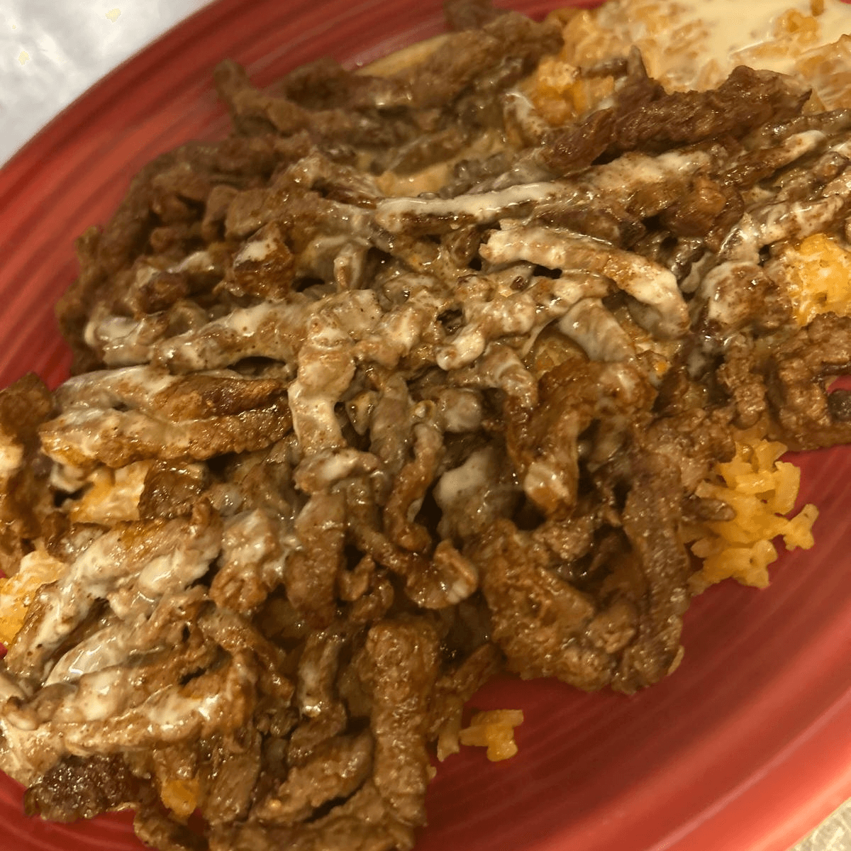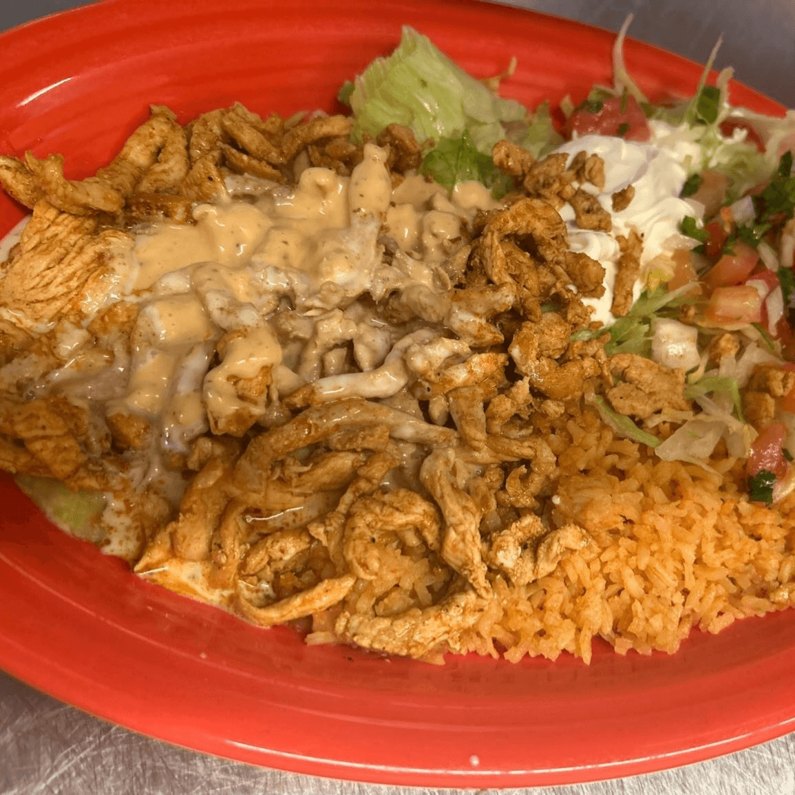 Popular. Mexican rice topped with grilled chicken, steak and cheese sauce