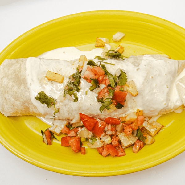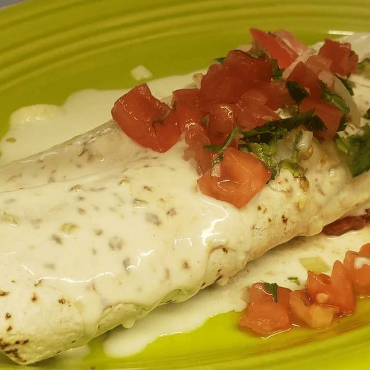 One large flour tortilla stuffed with grilled chicken, rice, green peppers and covered with creamy chipotle sauce and pico de gallo. Served with choice of rice or beans