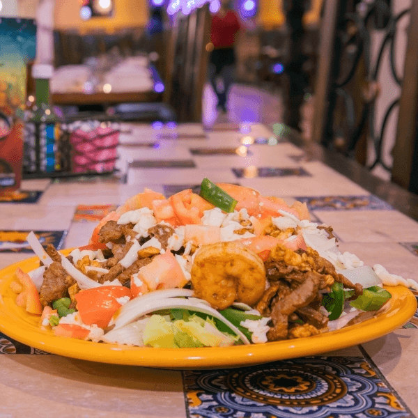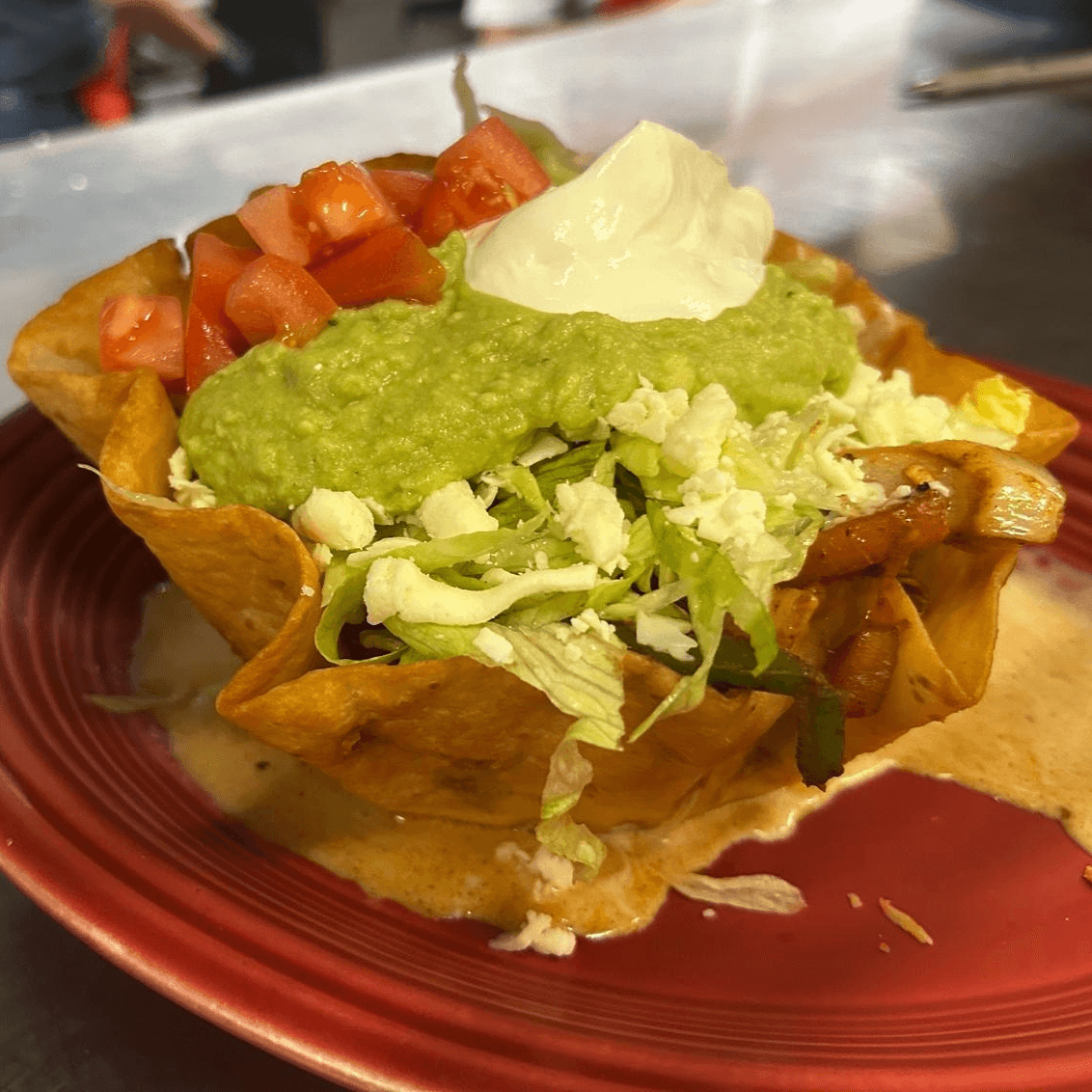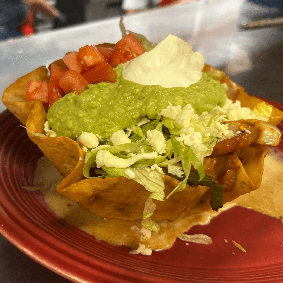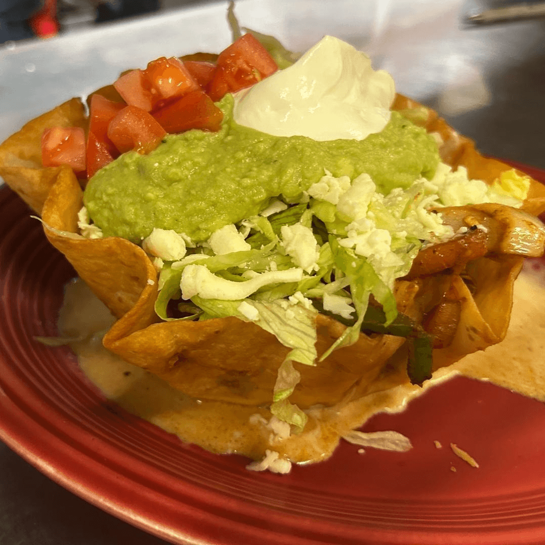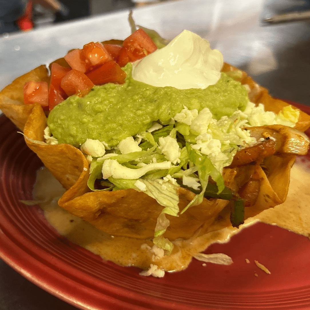 A crispy flour tortilla bowl filled with grilled shrimp, sautéed onions, and bell peppers. Topped with cheese sauce, lettuce, guacamole, sour cream, and tomatoes