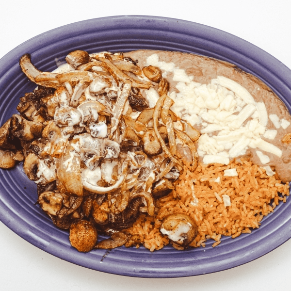Served with rice and beans with choice of onions, mushrooms, and cheese dip, shrimp and cheese dip, chorizo and cheese dip, special red sauce, onions, tomatoes, and bell peppers