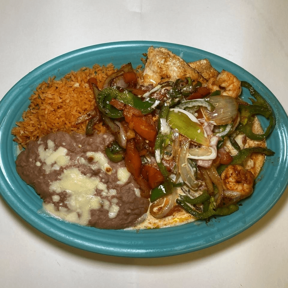 Grilled shrimp cooked with pineapple slices and Mexican sausage. Cheese sauce poured on top to finish it off. Served with refried beans, Mexican rice