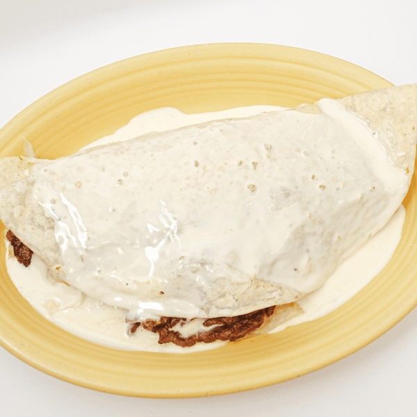 12-Inch tortilla stuffed with cheese, meat, lettuce, pico de gallo and sour cream. Topped with cheese sauce