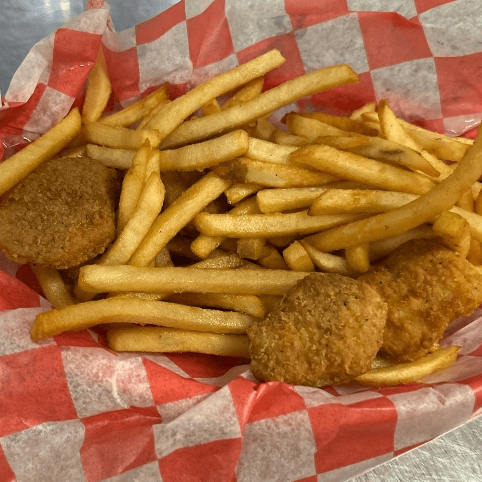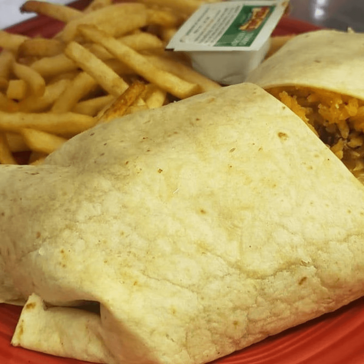 A wrap with diced tomatoes, lettuce, chipotle, and rice. Your choice of grilled chicken or steak. Served with a side of fries