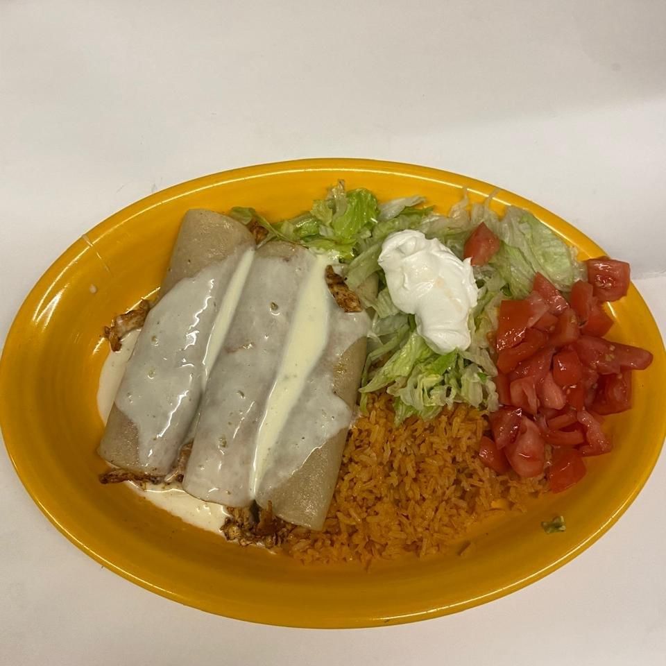 Three enchiladas topped with cheese dip. Served with rice, lettuce, tomatoes and sour cream