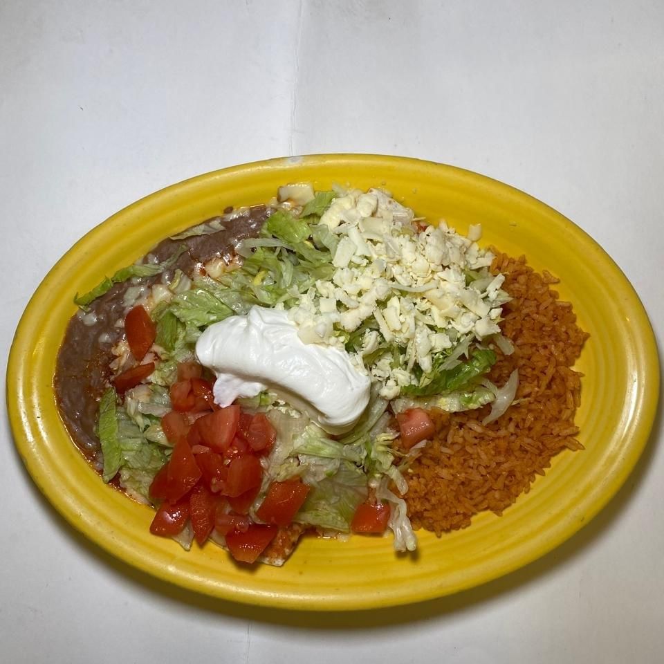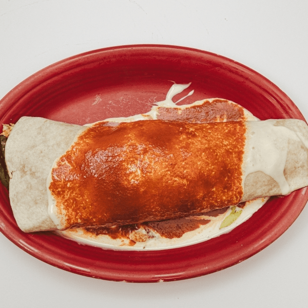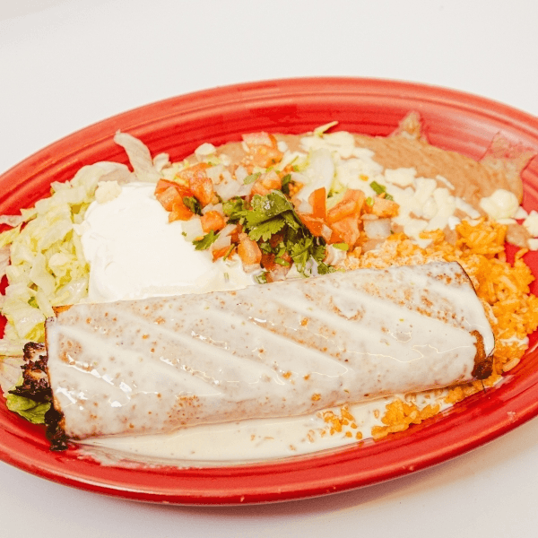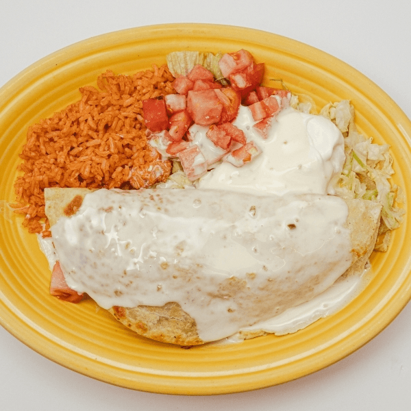 A flour tortilla filled with beef or chicken, topped with red sauce lettuce, sour cream, tomatoes, and cheese. Served with rice and beans. Substitute for steak or grilled chicken for an additional charge