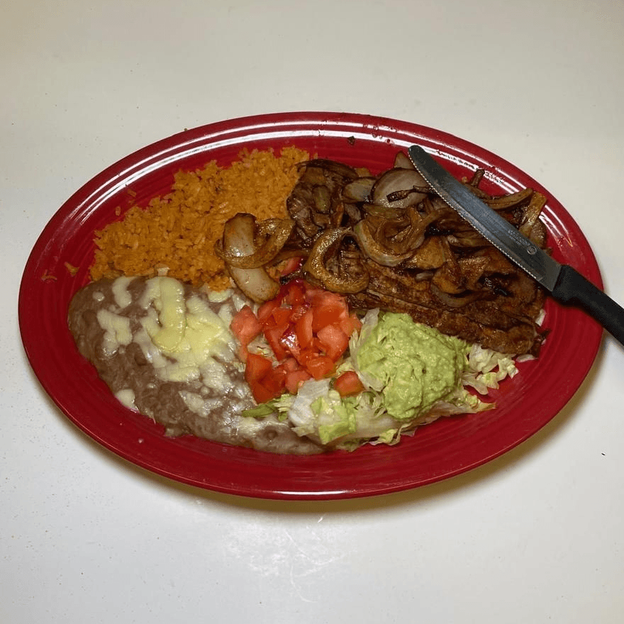 Tender beef sirloin topped with sauteed onions. Served with Mexican rice, beans and guacamole salad