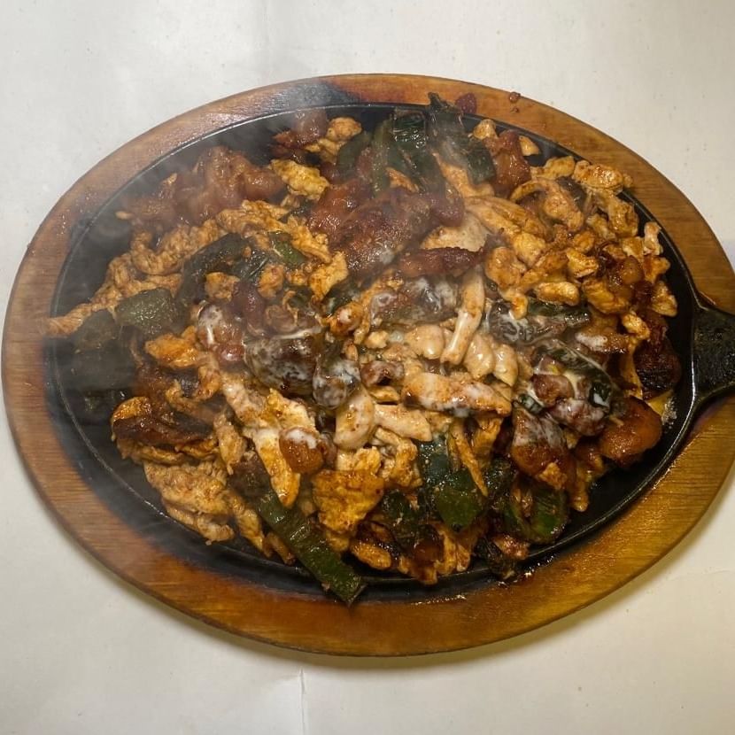 Chicken, mushrooms, poblano pepper and bacon. Topped with cheese sauce