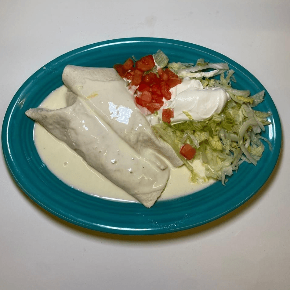 Popular. A grilled flour tortilla stuffed with cheese and meat, topped with cheese sauce. Served with rice, lettuce tomatoes and sour cream