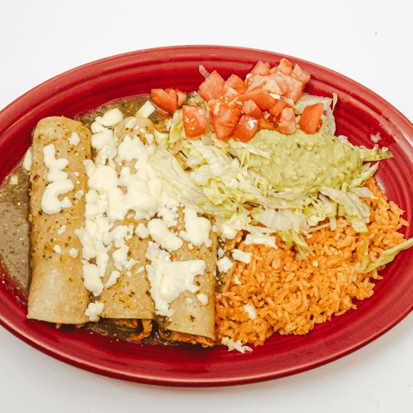 Three corn tortillas stuffed with grilled chicken, topped with tomatillo sauce (green sauce). Served with rice, lettuce, guacamole and tomatoes