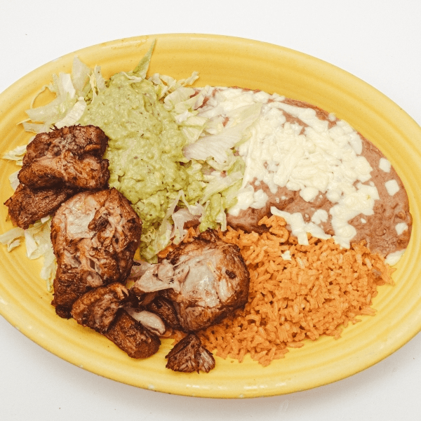Pork tips served with lettuce, pico de gallo, guacamole, rice and beans