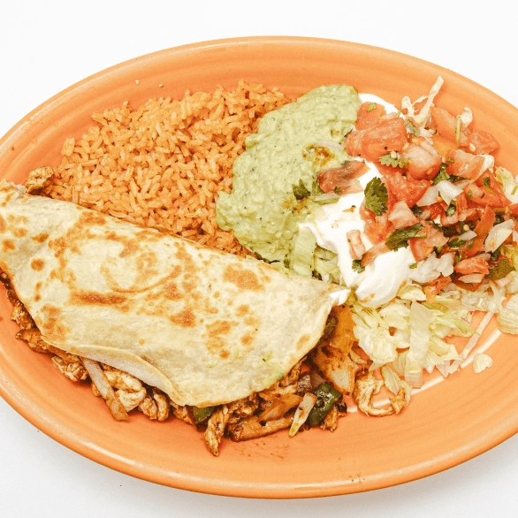 A cheese quesadilla filled with sauteed onions, bell peppers, tomatoes and meat. Served with rice, lettuce, guacamole, pico de gallo and sour cream