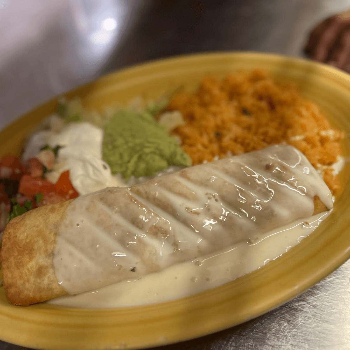 A flour tortilla stuffed with your choice of shredded chicken or ground beef, deep-fried and topped with cheese sauce. Served with lettuce, sour cream, pico de gallo, guacamole, refried beans, and Mexican rice